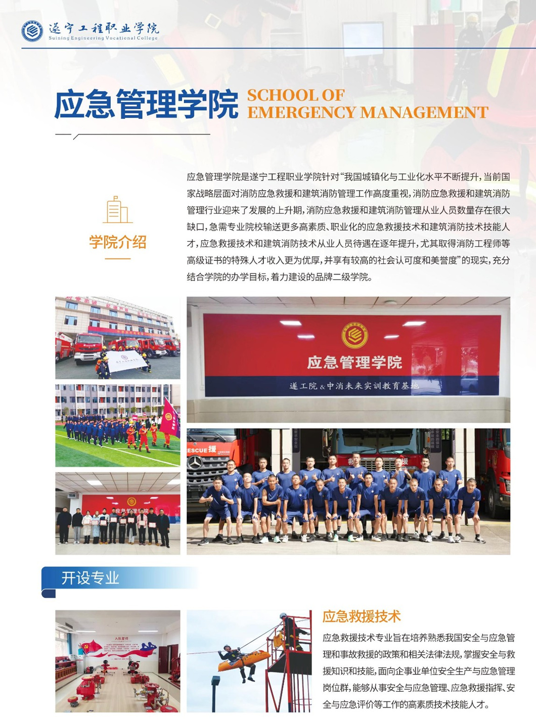 应急管理学院是遂宁工程职业学院针对“我国城镇化与工业化水平不断提升,当前国家战略层面对消防应急救援和建筑消防管理工作高度重视,消防应急救援和建筑消防管理行业迎来了发展的上升期,消防应急救援和建筑消防管理从业人员数量存在很大缺口,急需专业院校输送更多高素质、职业化的应急救援技术和建筑消防技术技能人才,应急救援技术和建筑消防技术从业人员待遇在逐年提升,尤其取得消防工程师等高级证书的特殊人才收入更为优厚,并享有较高的社会认可度和美誉度”的现实,充分结合学院的办学目标,着力建设的品牌二级学院。