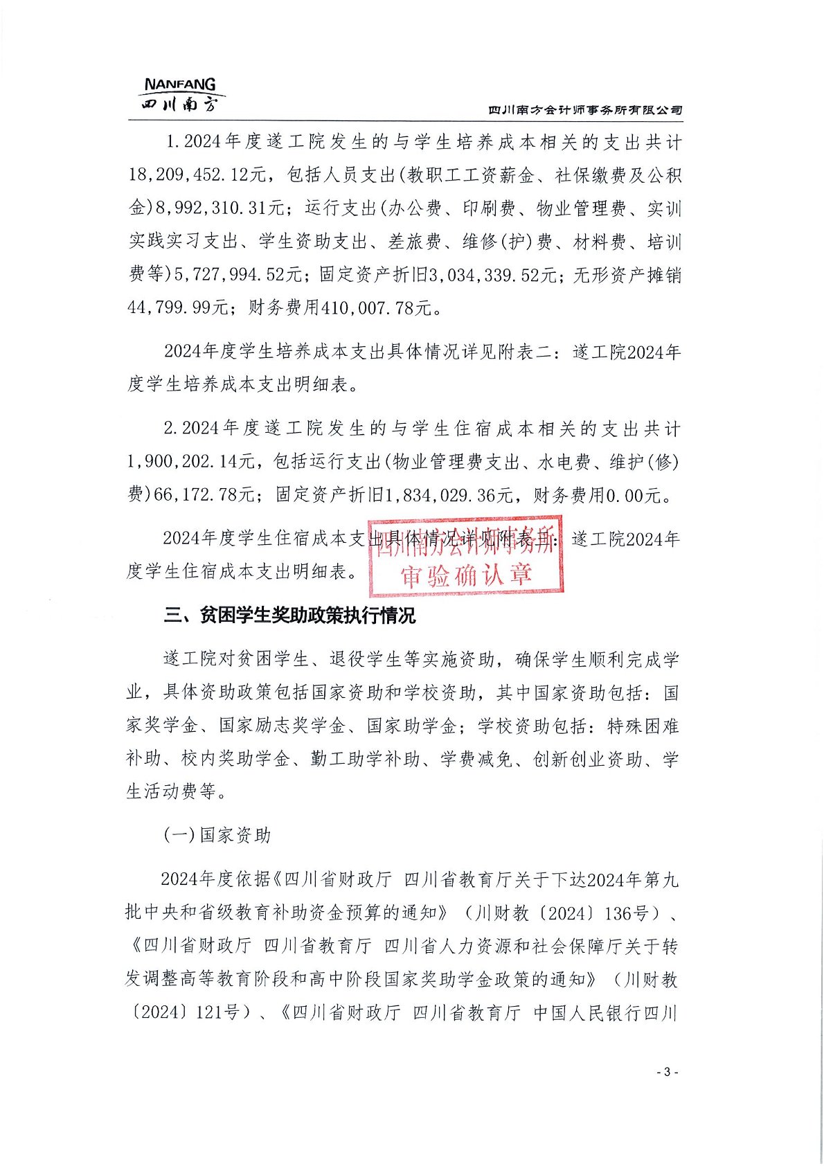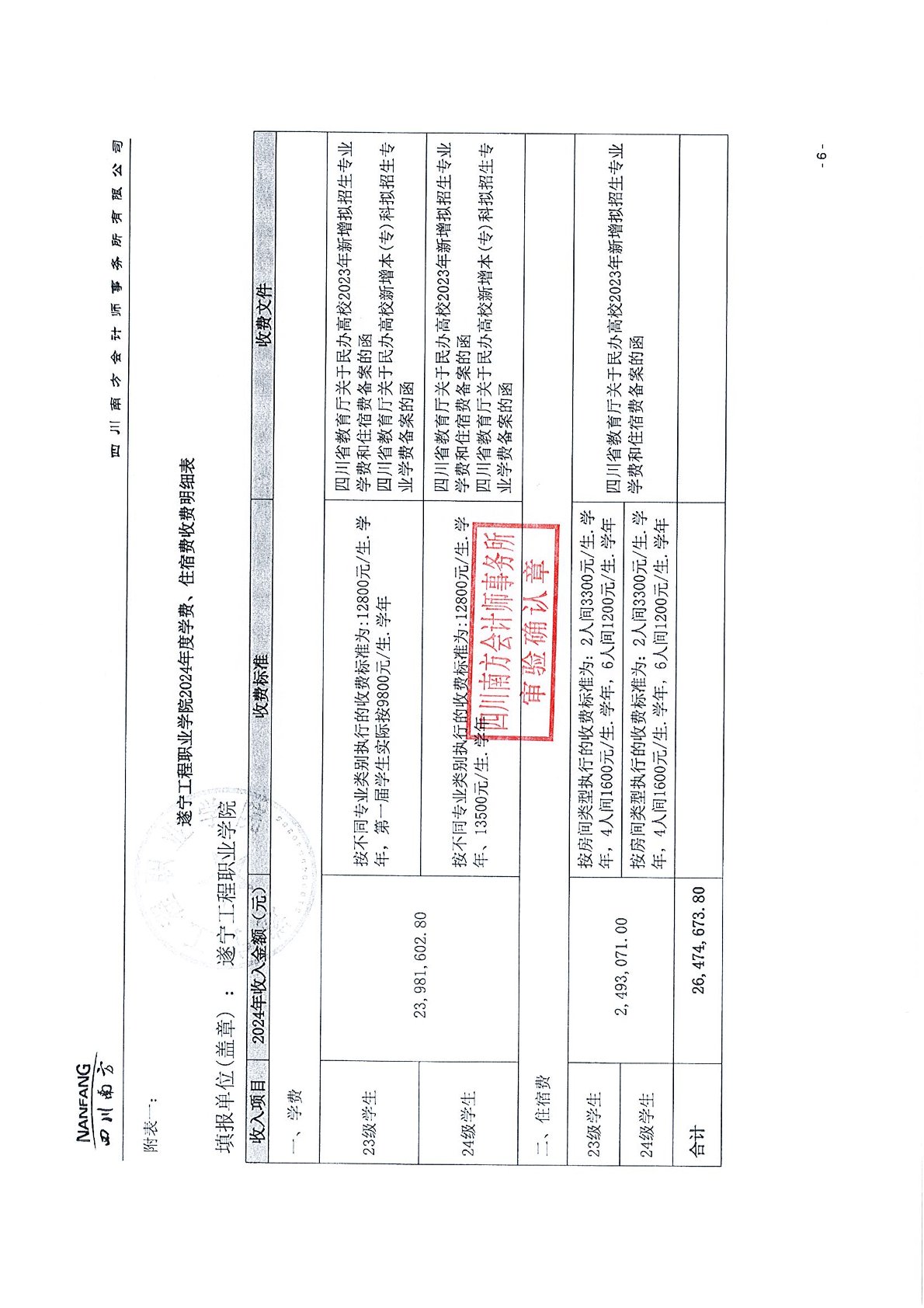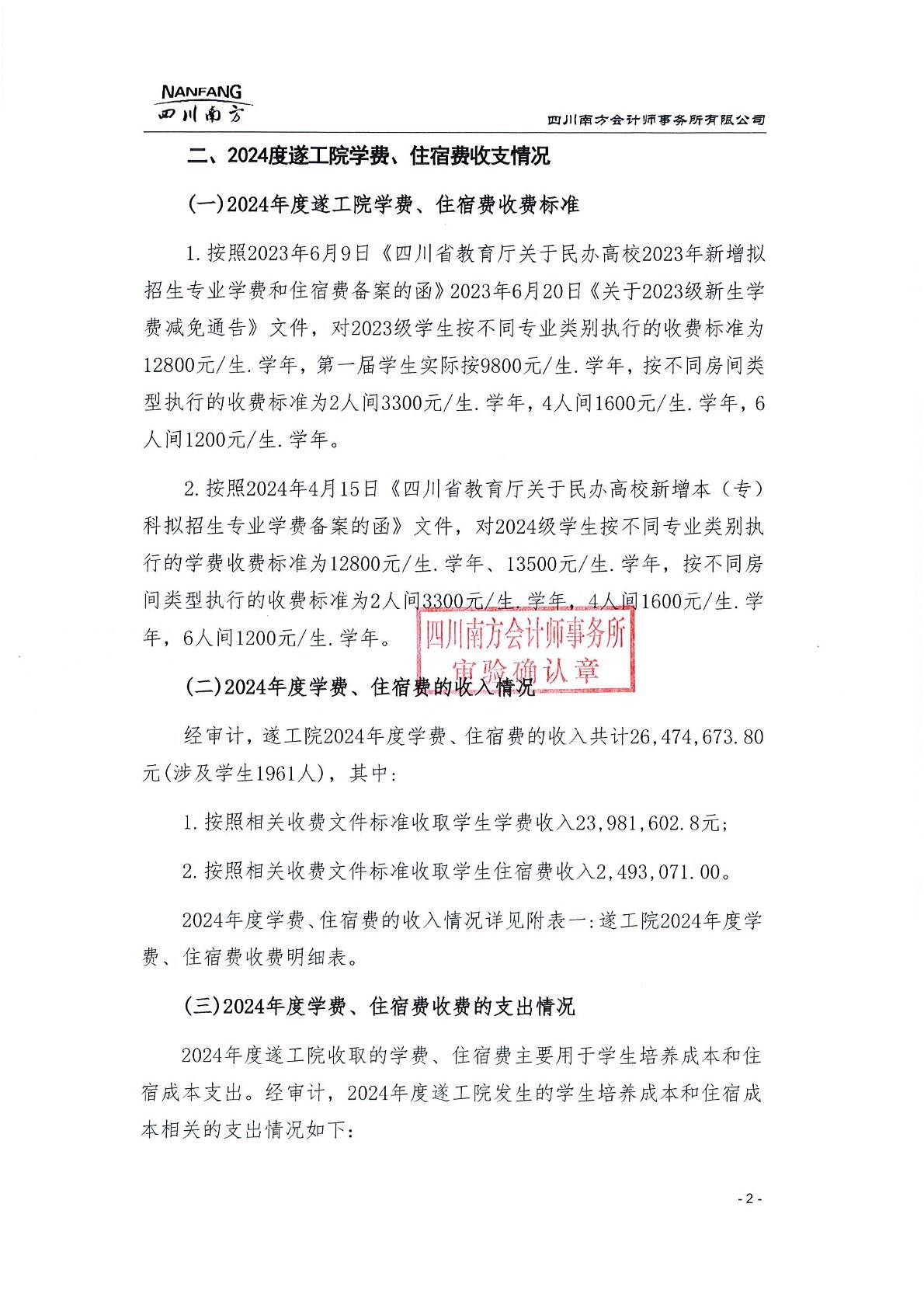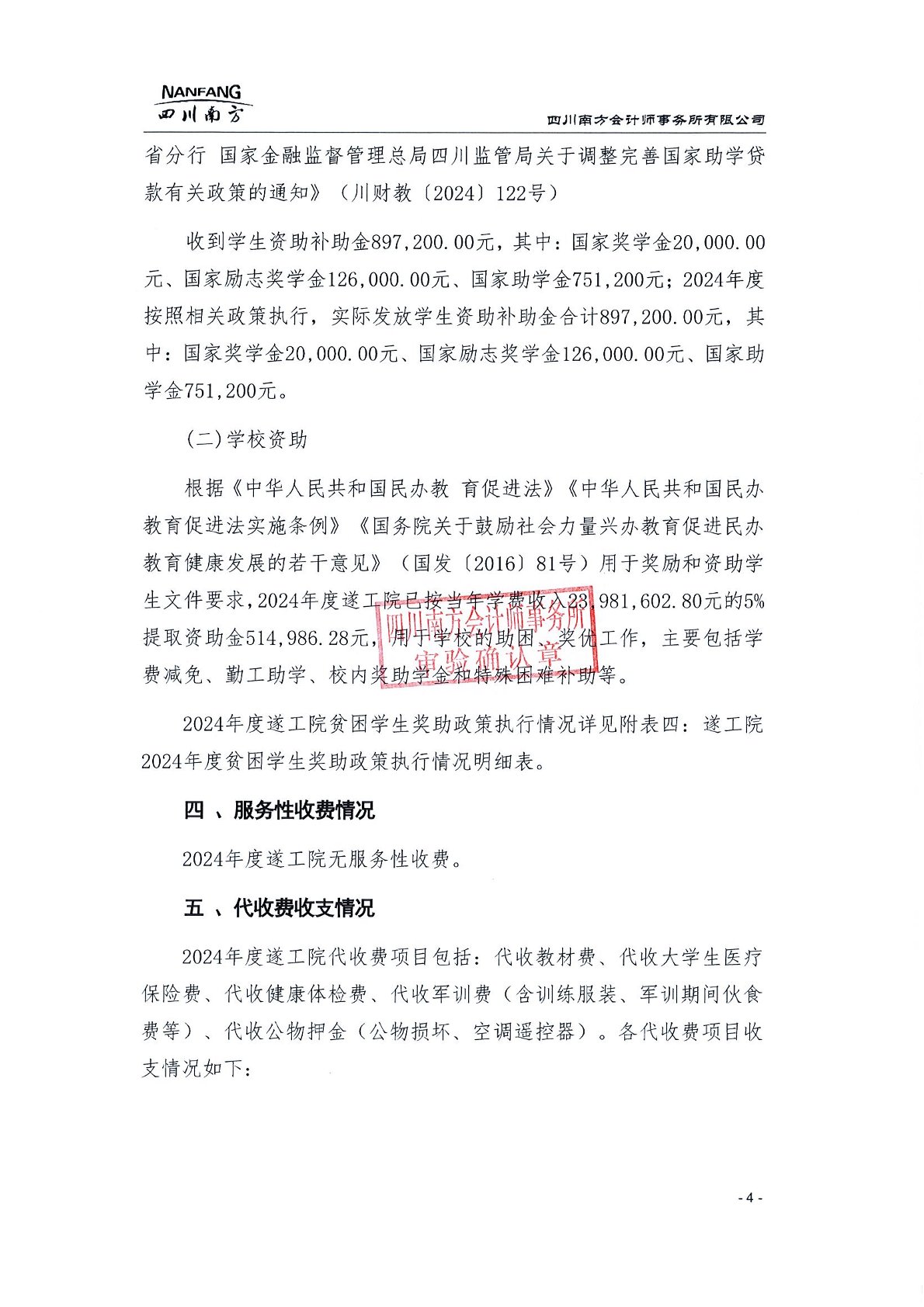 遂宁工程职业学院2024年学费、住宿费、服务性收费和代收费收支情况及贫困学生奖助政策情况审计报告