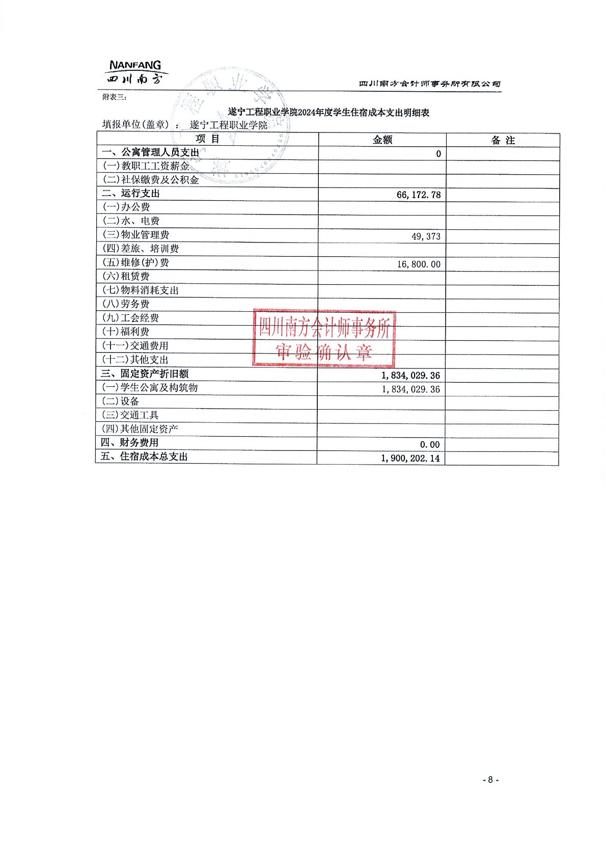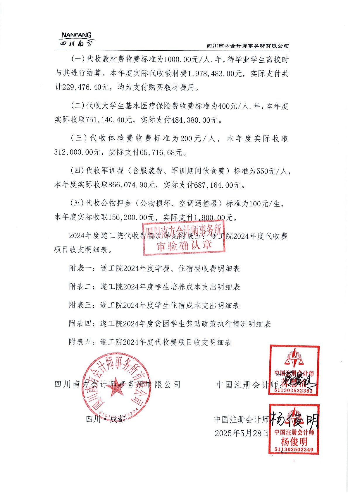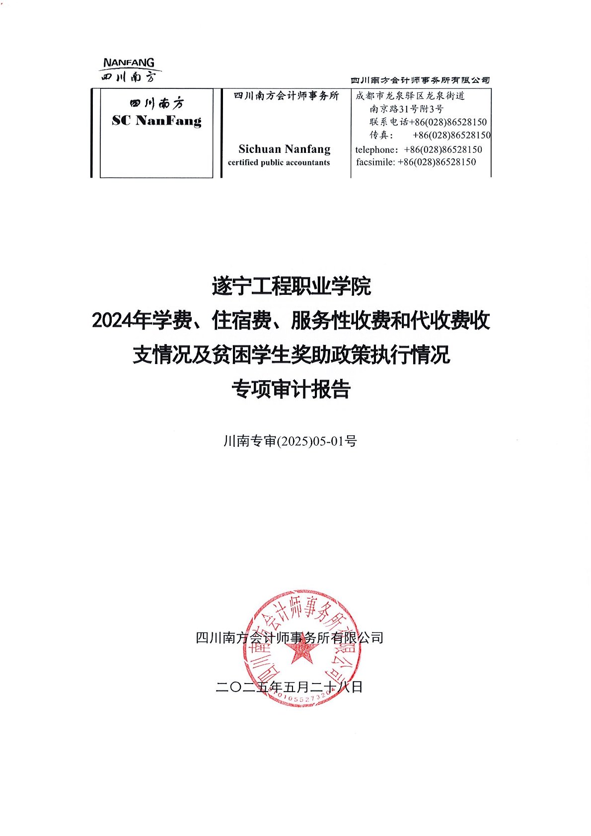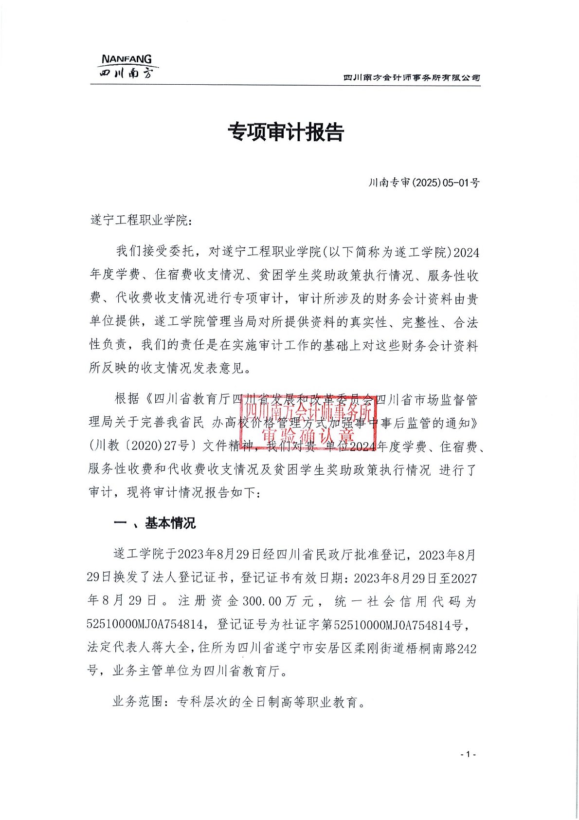 遂宁工程职业学院2024年学费、住宿费、服务性收费和代收费收支情况及贫困学生奖助政策情况审计报告